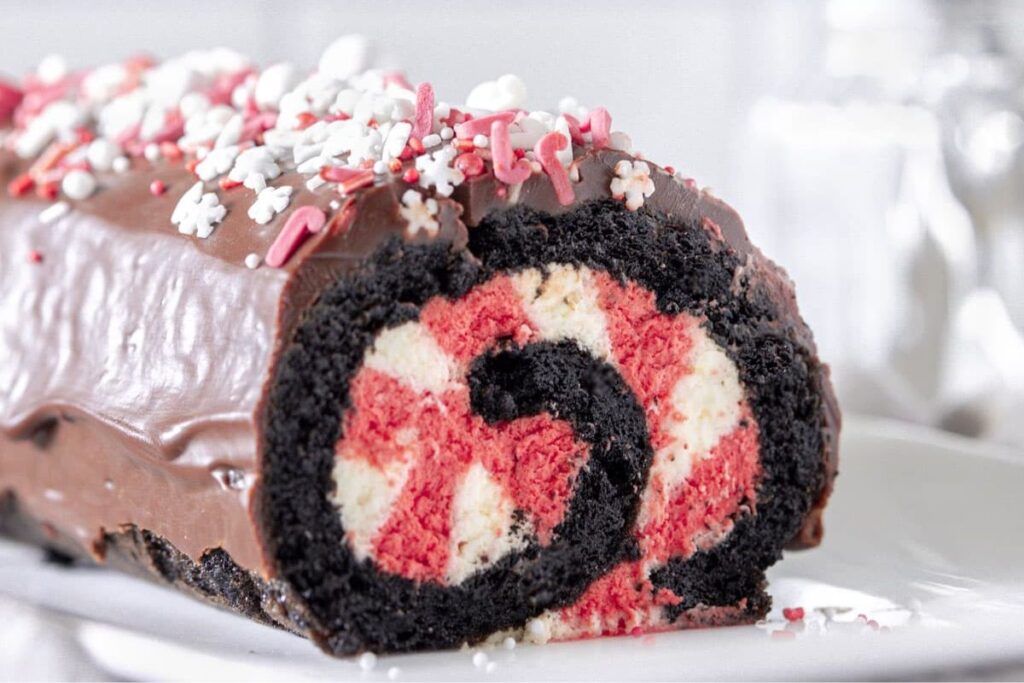 This chocolate peppermint swiss roll is to-die-for! With a fun candy cane inspired peppermint cream filling, wrapped up inside a rich and fluffy chocolate roll cake, and coated with a glossy chocolate ganache, it’s perfect for Christmas!